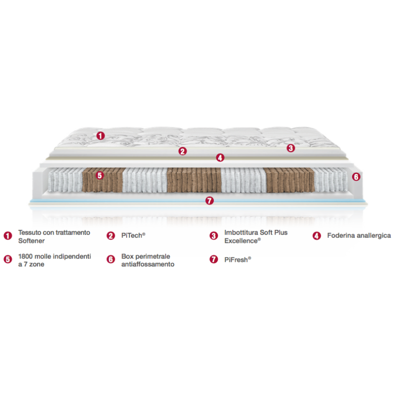 La struttura a 1800 molle indipendenti a 7 zone a portanza differenziata è stata abbinata allo strato di PiTech® nel lato superiore (un materiale innovativo altamente performante), ed al PiFresh® nel lato inferiore (traspirante e rivitalizzante).