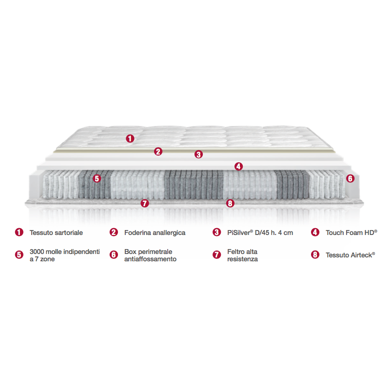 La struttura portante a 3000 molle indipendenti a 7 zone a portanza differenziata è avvolta in un box in Touch Foam® ad alta densità, traspirante ed elastico; la parte superiore è arricchita con uno strato in PiSilver® che, grazie alle microparticelle d'argento, rende questo materasso antibatterico, pertanto salubre, consentendone un ottimale adattamento alle forme del corpo e favorendo il rilassamento muscolare.